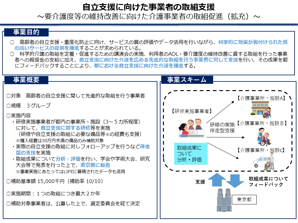 この取組を一層進めるため、高齢者の自立支援に向けた先進的な取組を行う都内の介護事業所や施設への支援を行う事業者を以下のとおり募集します。
