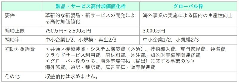 申請枠が再編され、19次締切以降、補助区分は「製品・サービス高付加価値化枠」「グローバル枠」となっています。