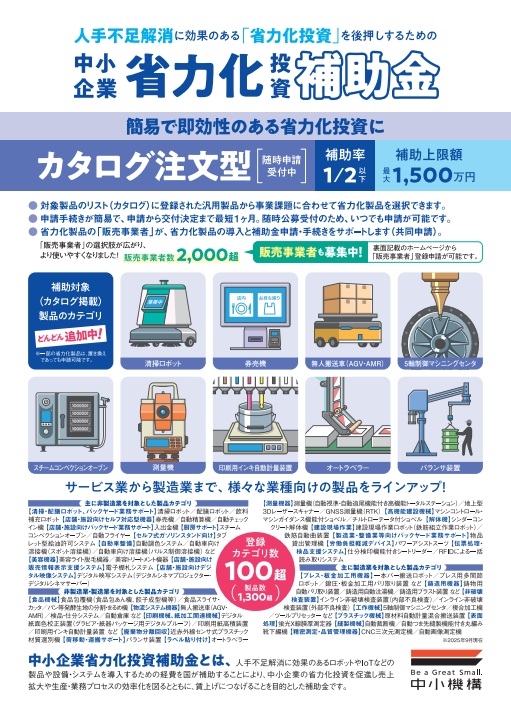 省力化投資補助金(カタログ注文型)は、人手不足に悩む中小企業等が行う、IoT・ロボット等の人手不足の解消に効果がある汎用製品の導入を支援する制度です。