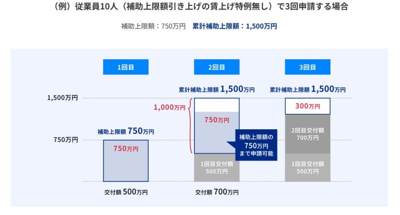 そのうえで、前回までの累計交付額を差し引いた額を上限として申請できます。ただし、各申請においては、当該申請時点で定まる補助上限額を超える金額の申請はできません。