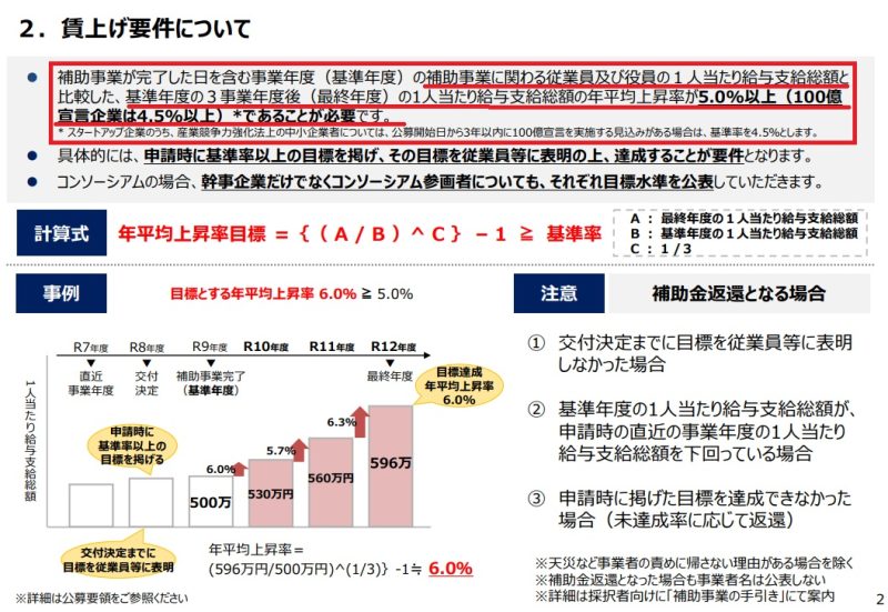 具体的には、4次公募では、補助事業終了後3年間における「補助事業に関わる従業員および役員」の1人当たり給与支給総額について、年平均上昇率4.5%以上とすることを求めていました。