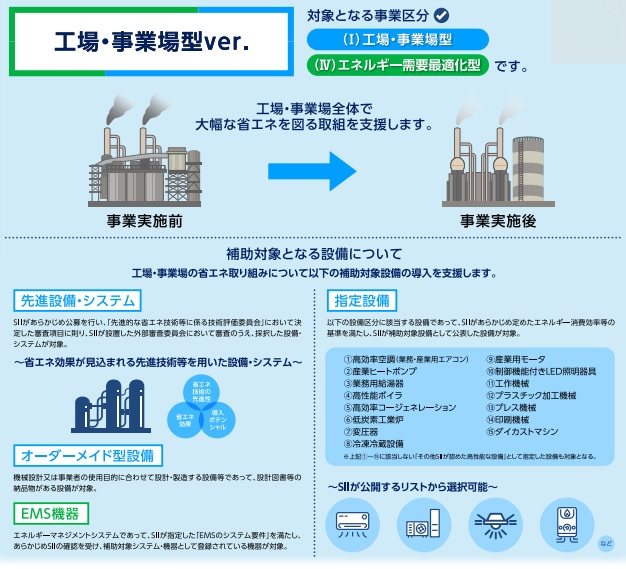 「工場・事業場型」は、(Ⅰ)工場・事業場型と(Ⅳ)EMS型で構成しており、工場・事業場全体で大幅な省エネを図る取り組みを支援する区分です。