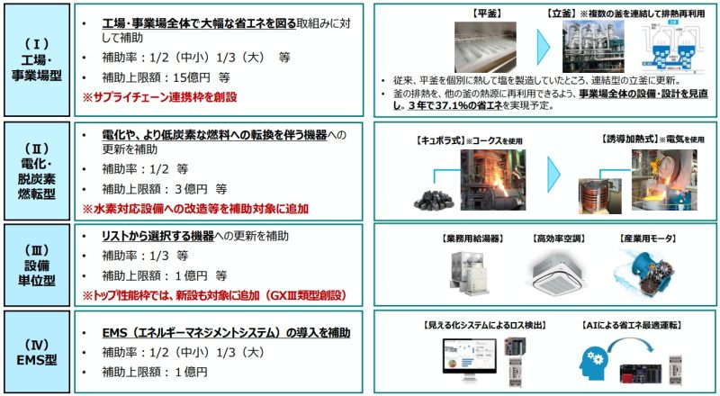 「省エネ補助金」は、企業等による省エネ設備等の導入を支援する制度です。以下のとおり、4つの類型に分かれており、更新する設備の内容や目的に応じて申請できます。