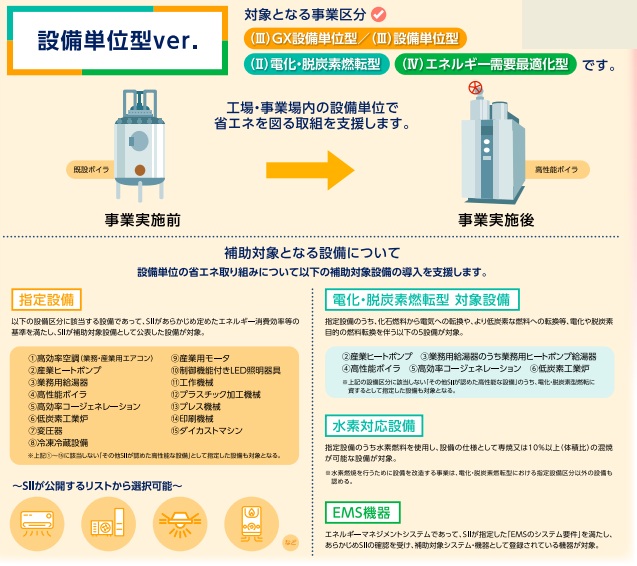 「設備単位型」は、(Ⅱ)電化・脱炭素燃転型と(Ⅲ)設備単位型で構成しており、設備単位での省エネ設備更新を支援する区分です。