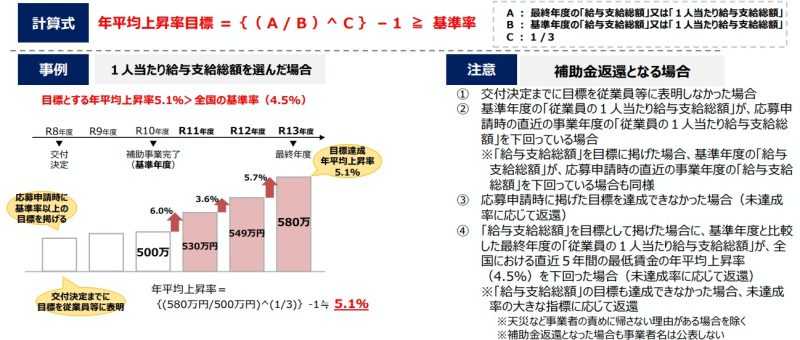 賃上げ目標として「給与支給総額」を選択した場合でも、基準年度と比較した最終年度の「従業員の1人当たり給与支給総額」が、全国における直近5年間の最低賃金の年平均上昇率4.5%)を下回った場合は未達成率に応じて補助金返還となりますのでご注意ください。