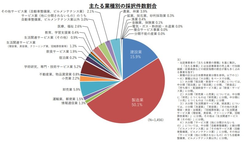 採択件数を業種別の割合で見ると、これまでと同じく「製造業」がもっとも多く、50.1%(前回比 −1.2%)を占めています。次いで「建設業」が15.9%(前回比 +0.4%)となりました。