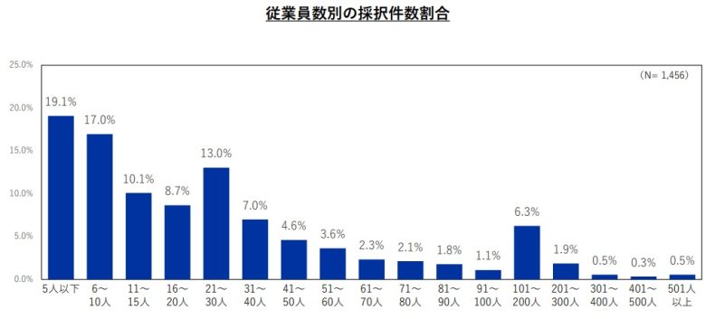 従業員数別の採択割合を見ると、「5人以下」の事業者が最も多く、19.1%を占めました。次いで多いのは「6~10人」規模の事業者で、17.0%を占めています。