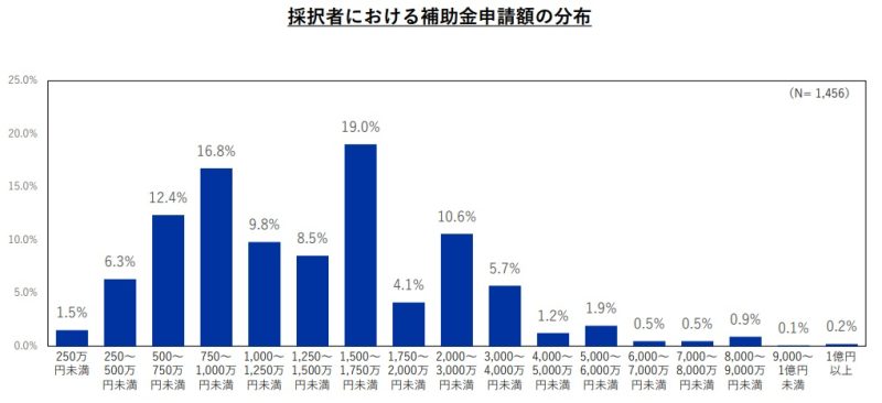 採択者における補助金申請額を見た場合、過去公募の傾向と同じく「1,500万円~1750万円未満」の層が19.0%を占めてもっとも多い結果となりました。
