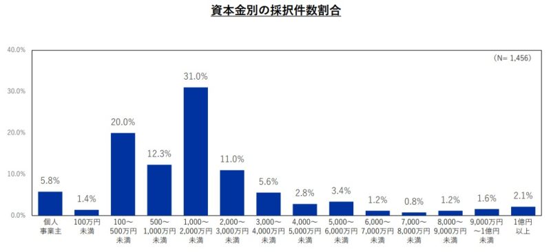 次いで多かったのは、「100万~500万円未満」が20.0%、「500万~1,000万円未満」が12.3%です。全体としてみると、相対的に資本金の小さい事業者の採択が多い傾向が伺えます。