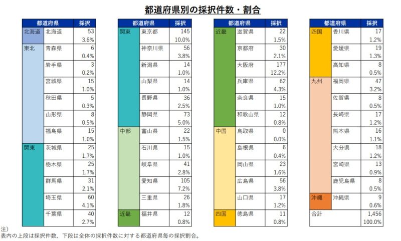 採択件数を都道府県別に見ると、大阪府が最も多く177件(全体の12.2%)でした。続いて、東京都が145件(10.0%)、愛知県が105件(7.2%)となっています。