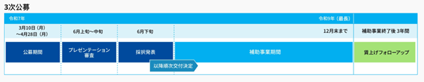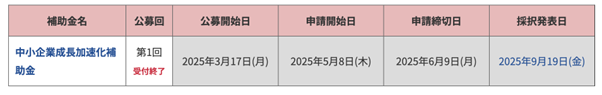 成長加速化補助金の2025年の公募は現時点で1回行われており、スケジュールは以下のとおりです。