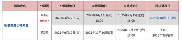 新事業進出補助金の2025年の公募は2回行われており、スケジュールは以下のとおりです。