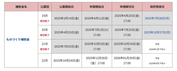 ものづくり補助金の2025年の公募は4回行われており、スケジュールは以下のとおりです。