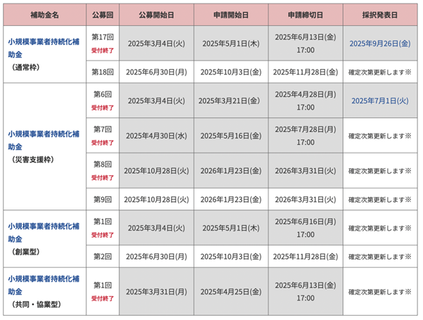 持続化補助金は、枠ごとに複数回公募されており、それぞれのスケジュールは以下のとおりです。
